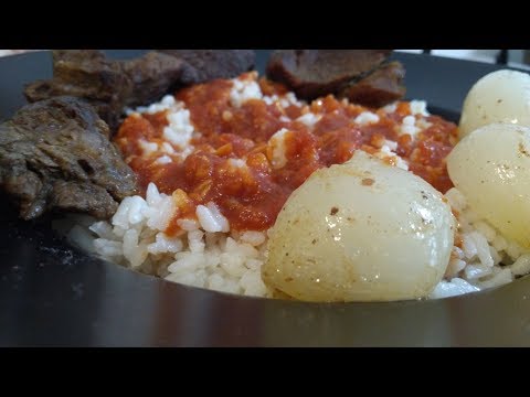 نحضر حله عالنار ونضيف زبده والثوم ونقلب كويس ونضيف الخل ونقلب ونحط عصير الطماطم ونضيف الصلصه ونقلب كويس ونضيف الملح والفلفل لحد مايتسبك وبعد كده نحضر حله اخرى ونضيف الزبده والارز ونقلب ونضيف المرقه ونغطى لحد مايستوى ونحضر طاسه ونضيف الزبده ونحط اللحمه تتحمر كويس وبعد كده نحضر طبق نحط العيش المحمص ونحط الرز ونسقسها بالمرقه ونضيف الصلصه ونزين باللحمه وناكل بالف هناا
